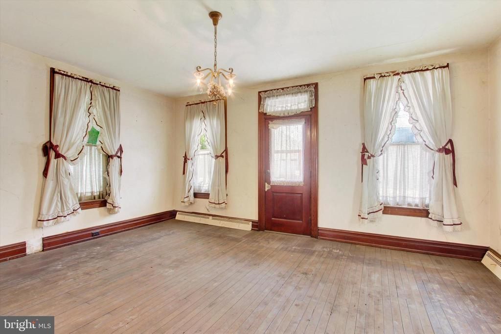 Spacious single-family home offering 4 bedrooms and 3.5 bathrooms, featuring flexible living spaces across multiple levels. Rich in historical charm, the home showcases classic details such as wood moulding, original doors, and distinctive rounded windows. The main level features a generously sized living room and a separate formal dining room, thoughtfully divided by French doors, each with its own private exterior entrance. The eat-in kitchen provides access to a covered porch, creating a comfortable space for outdoor enjoyment. An additional rear room with a full bathroom and separate entrance offers excellent potential for a guest suite, home office, or extended living area. The second level includes four bedrooms and two full bathrooms, along with a covered balcony shared by two of the bedrooms. The third level offers two versatile bonus rooms suitable for a home office or recreation space, along with a half bathroom. The unfinished basement includes two additional bonus rooms, interior access to the kitchen, and an exterior cellar door with covered steps. Additional features include a spacious, open yard, a two-story shed located directly behind the home, and a detached two-story garage at the rear of the property in need of repair. This home offers substantial space and flexibility, presenting a unique opportunity for customization and thoughtful updates.